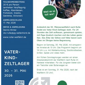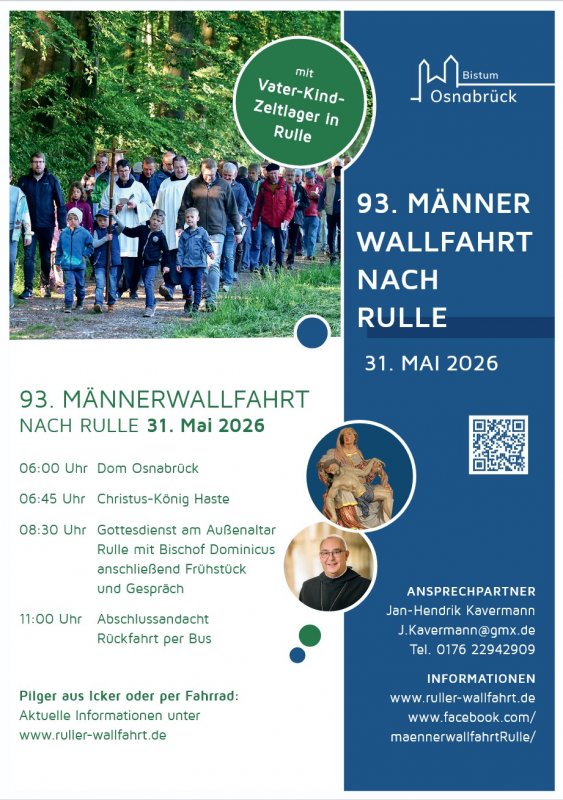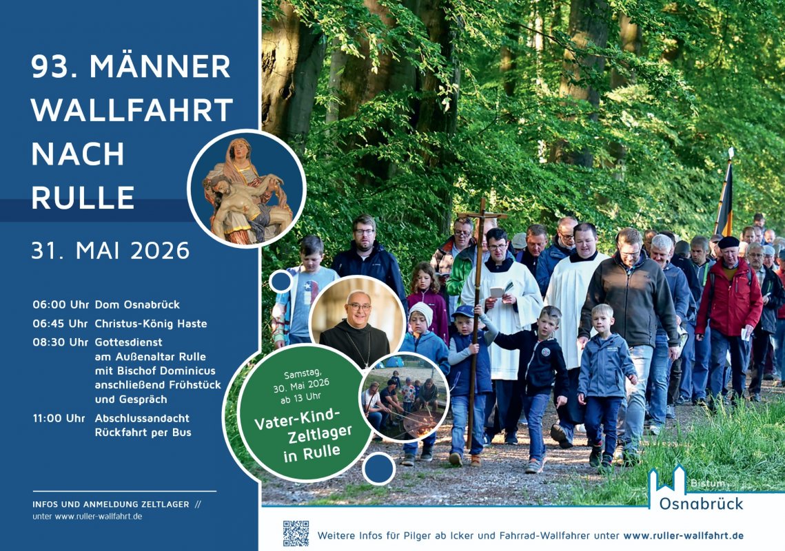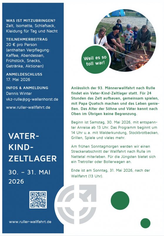 Bereits ab Samstagmittag gibt es für Väter und ihre Kinder gemeinsame Zeit beim Vater-Kind-Zeltlager an der Alten Schule in Rulle. Am Sonntag in der Frühe schließen wir uns der Wallfahrt an. Weitere Infos und Anmeldungen unter www.ruller-wallfahrt.de