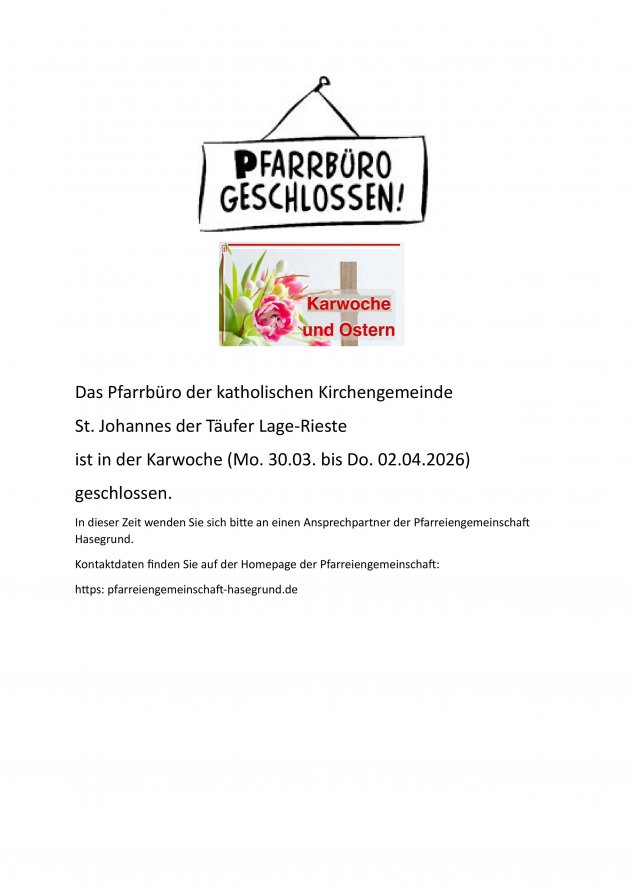 Pfarrbüro Lage-Rieste urlaubsbedingt geschlossen