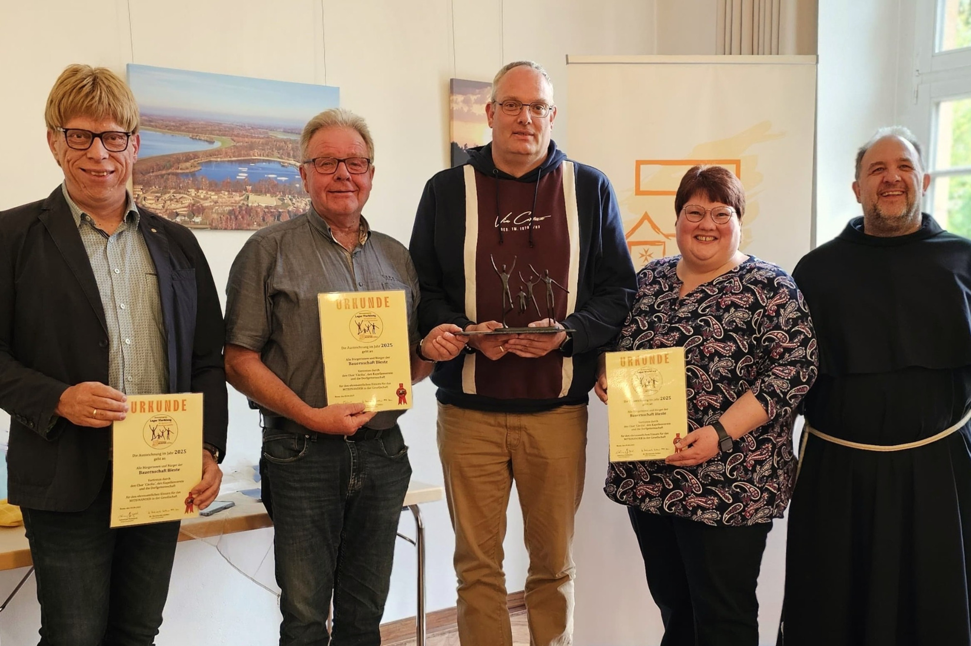 Bild A: Die Vertreter der Biester Vereine nehmen die Ehrung aus den Händen von Fördervereins-Vorsitzenden Sebastian Hüdepohl (links) sowie Bruder Bernhardin (rechts) entgegen: Axel Thye für die Dorfgemeinschaft e.V., Sascha Koop für den Kapellenverein und Anke Weilage für den Gesangverein Cäcilia Bieste.