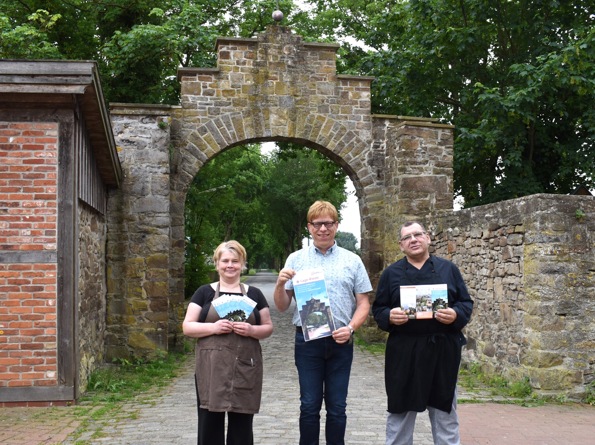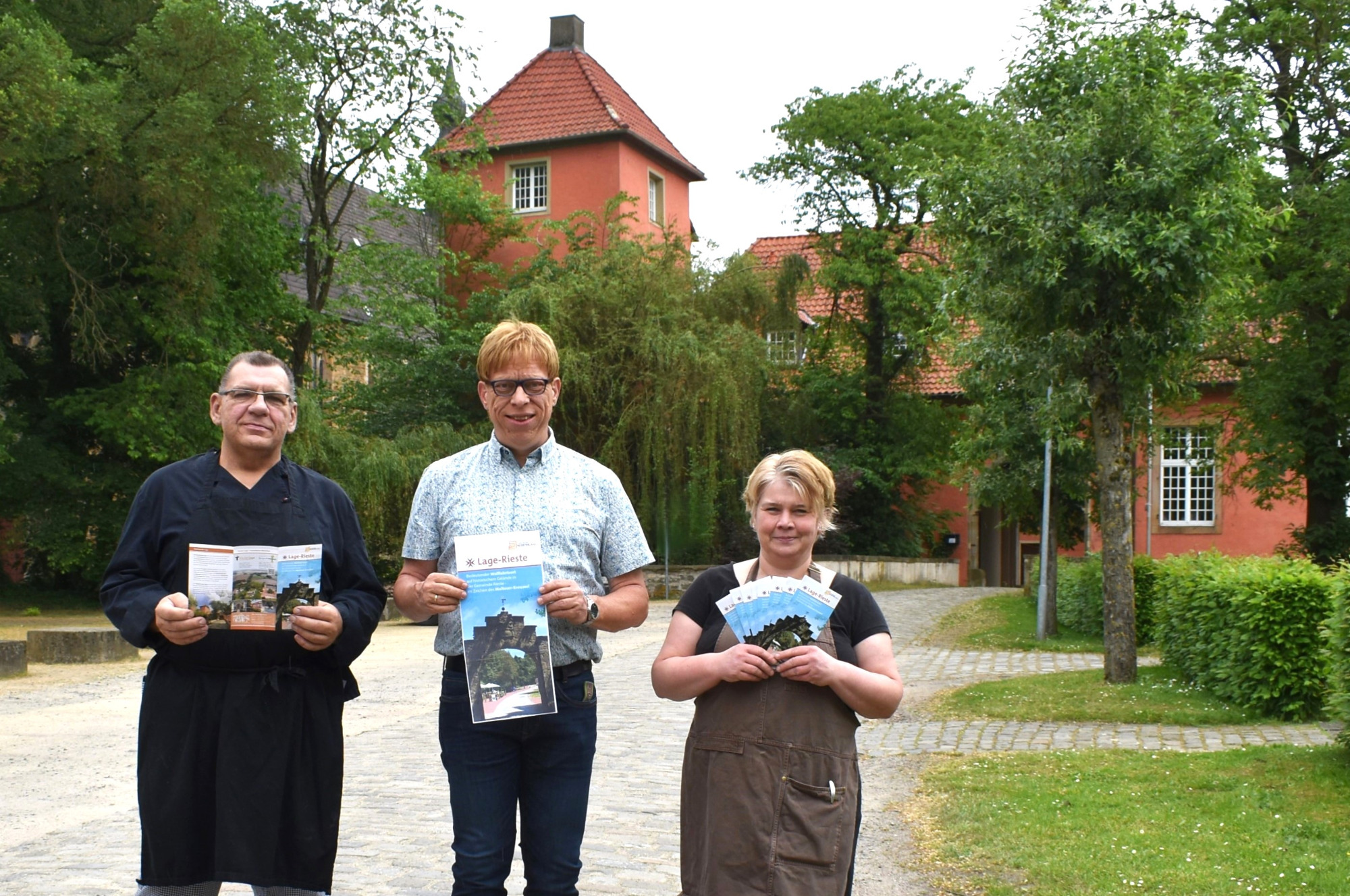 BILD1: Das Wirte-Ehepaar Ralf (links) und Claudia Haverkamp (rechts) präsentieren gemeinsam mit Fördervereins-Vorsitzendem Sebastian Hüdepohl (Mitte) den neu aufgelegten Flyer vor Ort – vor Kommende und Pfarrkirche in Lage-Rieste.